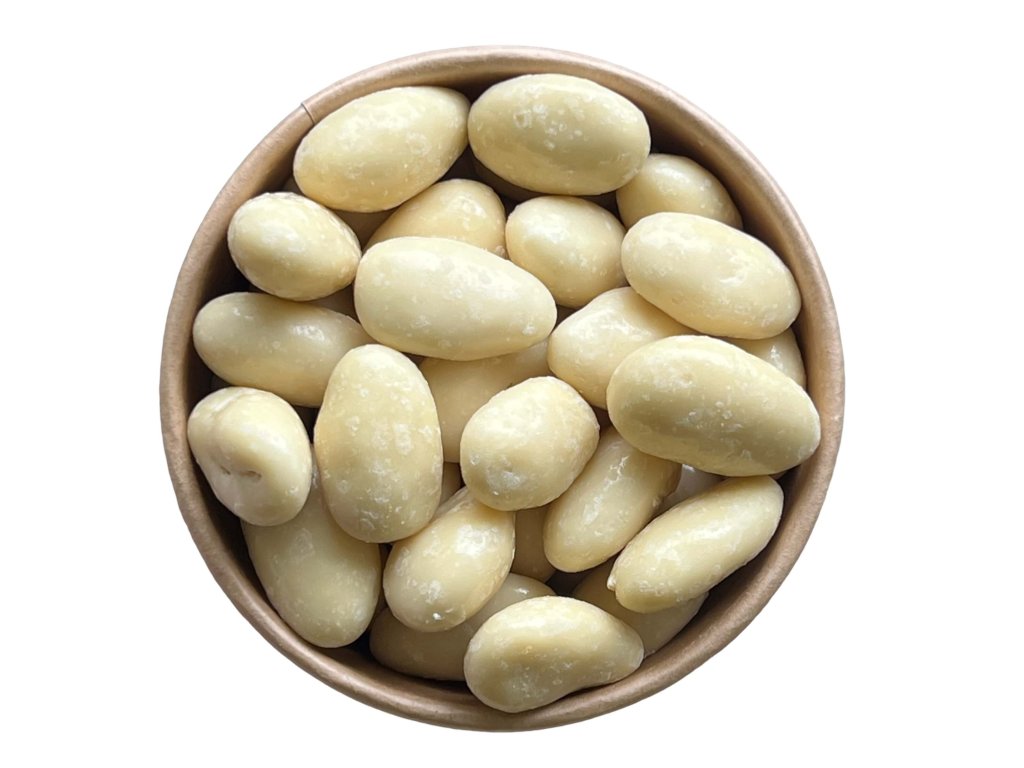 Složení: MANDLE jádra 25%, bílá čokoláda 75% (cukr, kakaové máslo, sušené plnotučné mléko, sušené odstředěné mléko, emulgátor: sójový lecitin, přírodní vanilkové aroma), leštící činidlo: arabská guma
